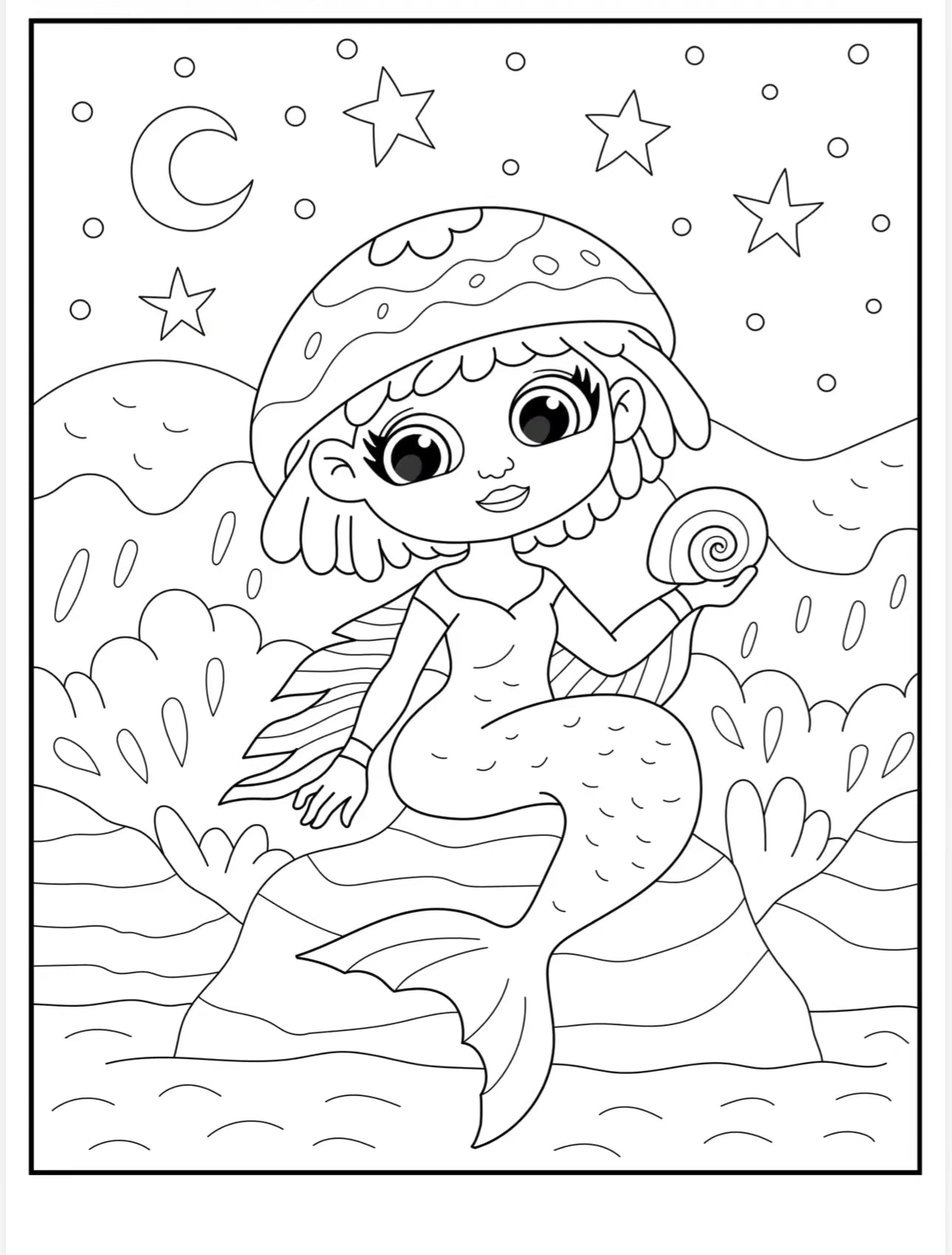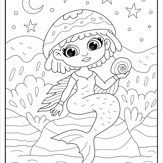 Drøm dig ned under havets overflade med Havfruer – Hygge pakke, en print-selv malepakke fyldt med 30 håndtegnede havfrue-illustrationer i et sødt og børnevenligt univers.
